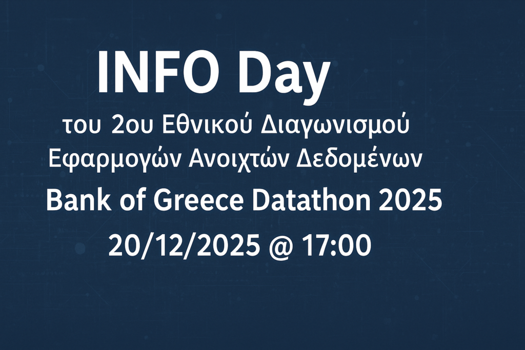 Σας προσκαλούμε στο INFO Day του 2ου Εθνικού Διαγωνισμού Εφαρμογών Ανοιχτών Δεδομένων – Bank of Greece Datathon 2025, όπου θα μάθετε τα πάντα για τον πιο καινοτόμο διαγωνισμό ανοιχτών δεδομένων της χρονιάς!