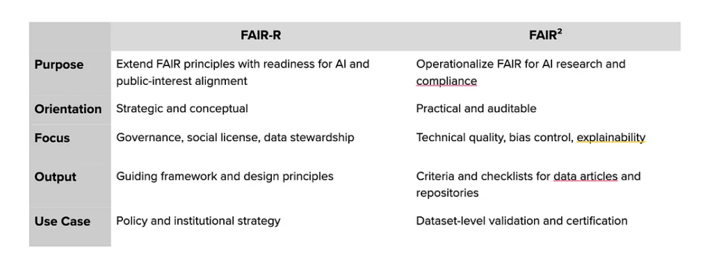 Αν και τα FAIR‑R και FAIR² μοιράζονται «γενετικό υλικό», αντιπροσωπεύουν δύο άκρα του ίδιου φάσματος: το FAIR‑R ρωτά γιατί πρέπει τα δεδομένα να είναι έτοιμα για ΤΝ και για ποιον, ενώ το FAIR² σού λέει πώς να το πετύχεις. Με αυτή την έννοια, το FAIR‑R λειτουργεί ως «πολικός αστέρας», ενώ το FAIR² προσφέρει την «πυξίδα και τον χάρτη».
